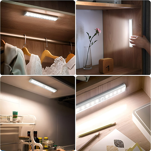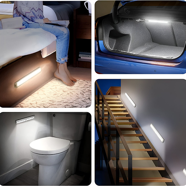 Vložte 4 AAA baterie a poté připevněte pomocí přiloženého magnetického proužku nebo lepicí pásky – žádné nářadí, žádné vrtání, žádné poškození zdi. Umístěte ho do skříně, pod kuchyňskou linku nebo vedle postele a funguje okamžitě.